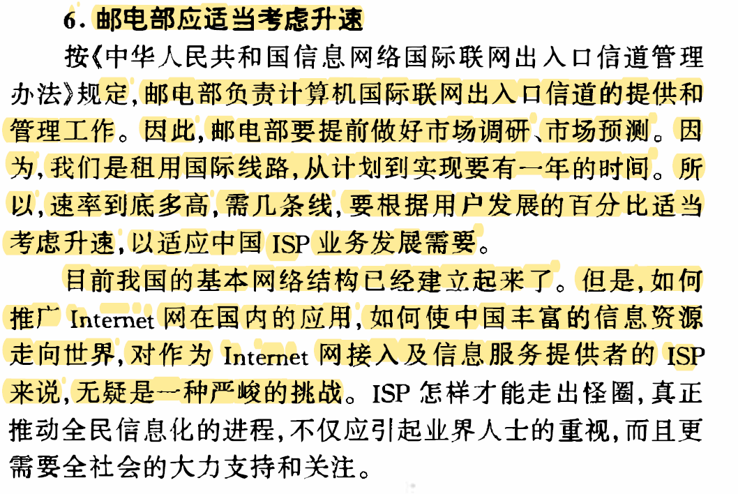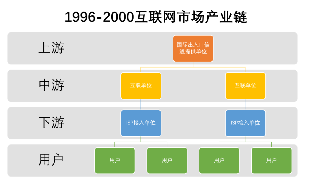 如何理解互联网络的功能?其系直接连通境外计算机,即掌控国际出入口信道资源,并建设国内骨干网的单位。在前文笔者曾描述当时的互联网产业状态——当时的互联网访问高度依赖境外资源,因此,掌控了国际出入口信道资源,就犹如和上游享有开采权的石油公司形成了稳定的供货关系。而正如前文所述,对于电信产业这一极端重要的上游领域,国家采取了行政垄断的做法,全权交由电信总局负责,旨在保护互联网产业正常运行。