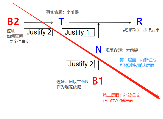 从整体上看,内部证成自身具备紧凑的论证结构,事实命题T和规范命题N属于系列推理中的终局形态,故而在此种紧凑的论证结构中推导出的结论具备了初步的不可争性,值得注意的是,此种初步的不可争性,正是形式主义法治围绕着保障法的顺畅实施、实现规则之治的体现。倘若承认了作为系列推理的终局形态的事实命题T或规范命题N,经由事实命题T和规范命题N运用正确推理形式推导而出的结论便具备了初步的不可争性。