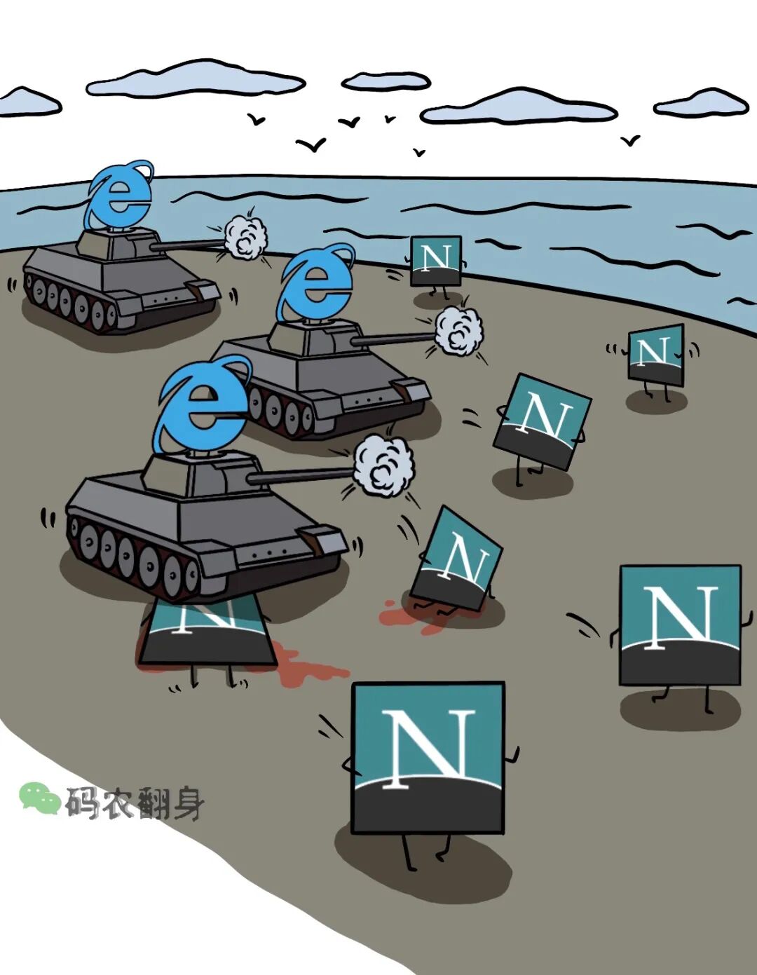 Netscape风靡网络,这让当年的软件霸主微软感受到了巨大的威胁, 微软推出了自己的浏览器Internet Explorer,希望成为Netscape Killer。