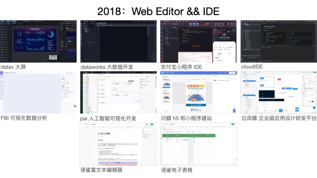 2015 年真的是技术发展非常蓬勃的一年,当然虽说很多技术可能在更早的时间 —— 比如说 2008年、2009 年 —— 就已经出现了,但是对于我而言,我觉得特别重要的那些技术,可能都是在 2015 年、2016 年那两年感知到的,那个时候技术真的是出现了一个大爆发,而且出现了非常多的能很好地落地到业务里的应用。这些技术现在仍然还在发展,但是近几年非常繁荣的可能是我们的 Web IDE 和 Web Editor。