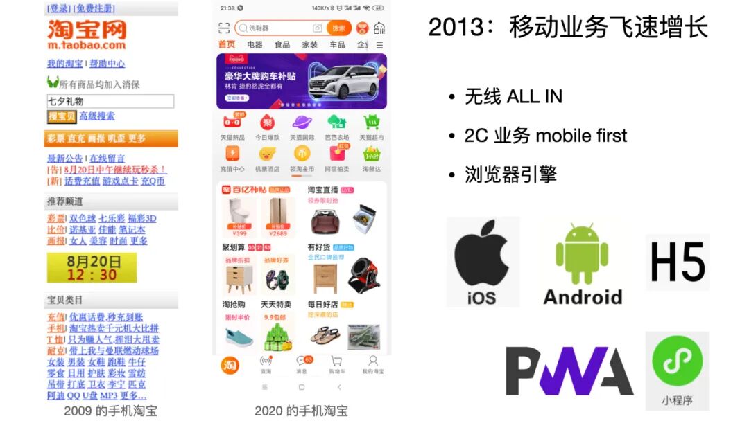 转机出现在 2013 年之后,我觉得整个前端行业走上了一个快车道。大家可以看一下左边的这张截图,一看就非常土,2009 年的一个手机淘宝页面,当然我当时有参与它的开发。这么土的一个页面 —— 我们刚刚说 PC 时代结束了兼容性的问题,而移动时代其实才刚刚开始 —— 哪怕是 2009 年这么土的一个页面,它也有非常多的兼容性问题要考虑,可能都是大家意想不到的。比如说,那个时候所谓的智能手机,其屏幕宽度差异是非常大的,我们为了确保每一行的文案都不折行,实际上需要采集当时市面上所有主流手机的屏幕尺寸,然后去做文案字数的适配。实际上在 2020 年,手机淘宝已经发展得非常好了,它跟 PC 没有什么太多的区别。
