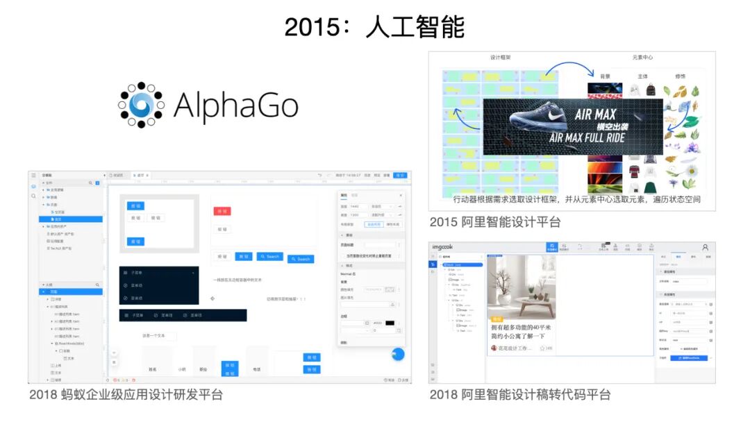 但人工智能应用会越来越广泛,它的门槛也会越来越低。我们在这方面做了一些应用上的尝试,包括 2015 年阿里的智能设计平台,以及 2018 年的智能设计稿转代码平台。这两个平台都是贴着营销大促这个场景在跑,因为当时在双十一或者 6.18 大促期间的 Banner,或者这种推荐产品的图,它们的量级已经达到了上亿级别,这已经根本不可能靠人工去做了,所以我们只能向技术要产能。所以大家想到了这样一些办法。还有一个就是我们团队现在在做的,蚂蚁企业级应用设计研发平台。可能大家会说,这看起来不就是一个 IDE 吗?它是怎么个人工智能法呢?这里我们先按下不表,待会再说。