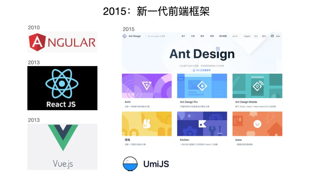 时间飞快地来到了 2015 年,由于之前“无线 All In”的事情,从很多团队调派了人手,集中人力去做了这么一件大事,所以作为团队留守的一些成员来说是比较伤的,因为业务被裁撤,人员也减少了。但是我们团队有一部分同学留下来了,我是其中之一,我们仍然在摸索 PC 端的一些可能性。这个时候其实新一代的研发框架已经逐步地生长起来了,最早的是2010 年的 Angular 以及 2013 年 React.js 和 Vue.js。在这几个框架当中,我们并没有犹豫太久。在 2015 年的时候我们团队就决定要使用 React。原因比较简单,因为 React 可能比 Angular 好用,比 Vue 灵活。但是这个不牵涉语言之争,仅仅是我们团队的一个选择哈。
