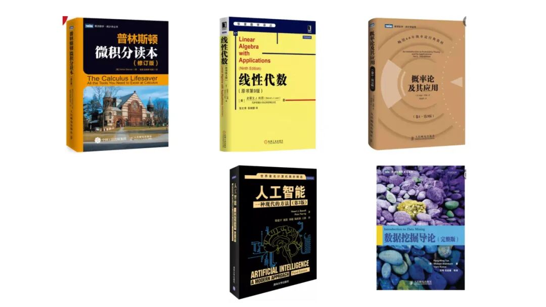 这是我给大家推荐的几本书。为什么是几本书呢?因为这些书其实是有一定的关联性的。上面的三本是《微积分》、《线性代数》跟《概率论》,这个可能是我们所有同学在读本科的时候基础的三门课程。下面是大家可能会觉得现在比较热门的、同学们也比较想去了解的,是《数据挖掘》以及《人工智能》。很多时候大家会看到有一些所谓的人工智能的入门书之类的,我建议大家如果真的对这两个东西感兴趣的话,可以看一看这两本书。这两本书都非常厚,但是《人工智能》这本书非常全面地讲述了人工智能领域所有的东西,当然有一些东西可能在今天看来比较过时,但仍然建议大家读一读,耐心一点把这本书读完。这本书读完了之后,对人工智能能带来哪些好处,或者说哪个方案会比较靠谱一些,你就会有比较坚定的自己的看法,包括你要跟相关的同学去沟通,你是不会发怵的。然后另外一个就是《数据挖掘》,现在大家都用数据说话嘛,所以数据挖掘也很重要。这本导论好就好在非常浅显易懂,基本上所有的方式方法你都能看得懂、用得着。所以这两本书非常推荐。