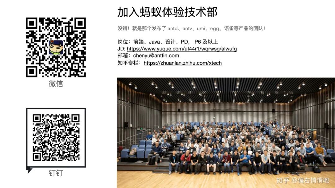 “对于前端人数比较少的团队来说,通常都是业务推动开发”,对于大的前端团队来说也是这样的,没有太多的区别。只是大家在这个场景下怎么去看待业务,比如你能不能在现有的业务里面看到一些更远的东西,这个很重要。其实我所在的团队可能是蚂蚁特别大的一个前端团队,但是也有一些团队是前端是比较大的,比如说我刚刚说的有一个大数据开发的 IDE,那个团队的同学,其实也是很厉害的,跟业务的大小有一定关系,但也并不是绝对的,有一些小团队他们可能做出来的东西也是很厉害的。另外如果说,你实在觉得没有太多的发挥之处了,比如说你每天在家扫地,扫地机器人这玩意你要是能想到可能特别牛,如果要是想不到的话,可能还是在家每天扫地,觉得没有什么价值感,可能确实得停下来想想自己想做的这个事的价值到底是什么。最后如果觉得还是想不清楚,跟别人聊了也很迷茫的话,建议去看一看其他团队,那些你觉得做得特别好的、有活力的团队,他们是怎么做的,或者说换个环境也是 OK 的。
