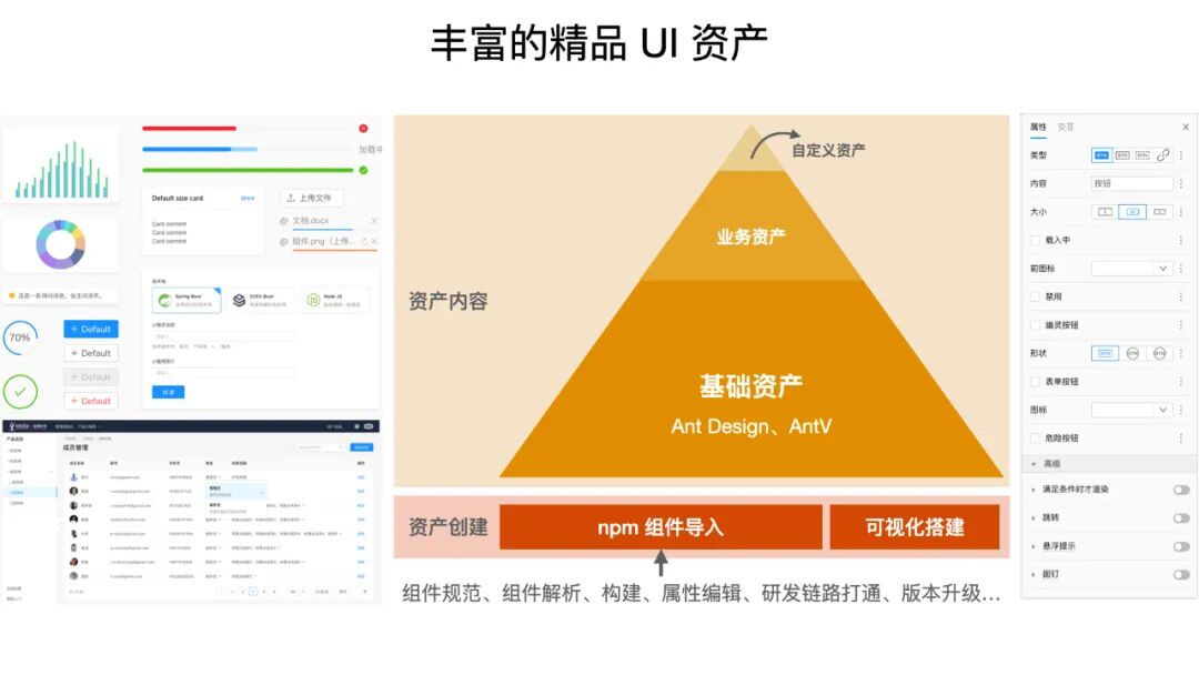 另外一个点就是丰富的精品 UI 资产。大家都知道我们在做应用研发的时候,最重要的两个东西是什么?一个是 UI 组件,另外一个是数据连接。UI 资产其实就是 UI 组件这方面,通常来说同类产品做这个选择都会非常艰难,要么就是一个封闭的资产体系,也就是说我有 100个 组件,你就只能用这 100 个组件,而好处是这 100 个组件我会把体验打磨得非常好,而一旦组件不满足要求,那完蛋,只能退到 ProCode。还有另外一种尝试叫做开放的组建体系,云凤蝶是走了这条路。