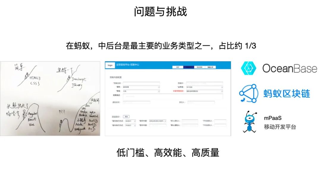 刚刚提到的是高效能,而另外一个就是高质量。这个可能大家不是很理解,因为一般来说中后台业务能跑就行了。屏幕中间就是一个非常典型的例子,也是我们公司内部的一个中后台产品的截图。但是我们刚刚提到过一点,即 2015 年是 toB 业务的元年,toB 的业务在最近几年是越来越受重视的,包括蚂蚁的很多重量级的业务也都是 toB 类的业务,包括蚂蚁区块链、Ocean Base、mPaas 等一些平台,所有这些会让我们对中后台的整体质量提出更高的要求。