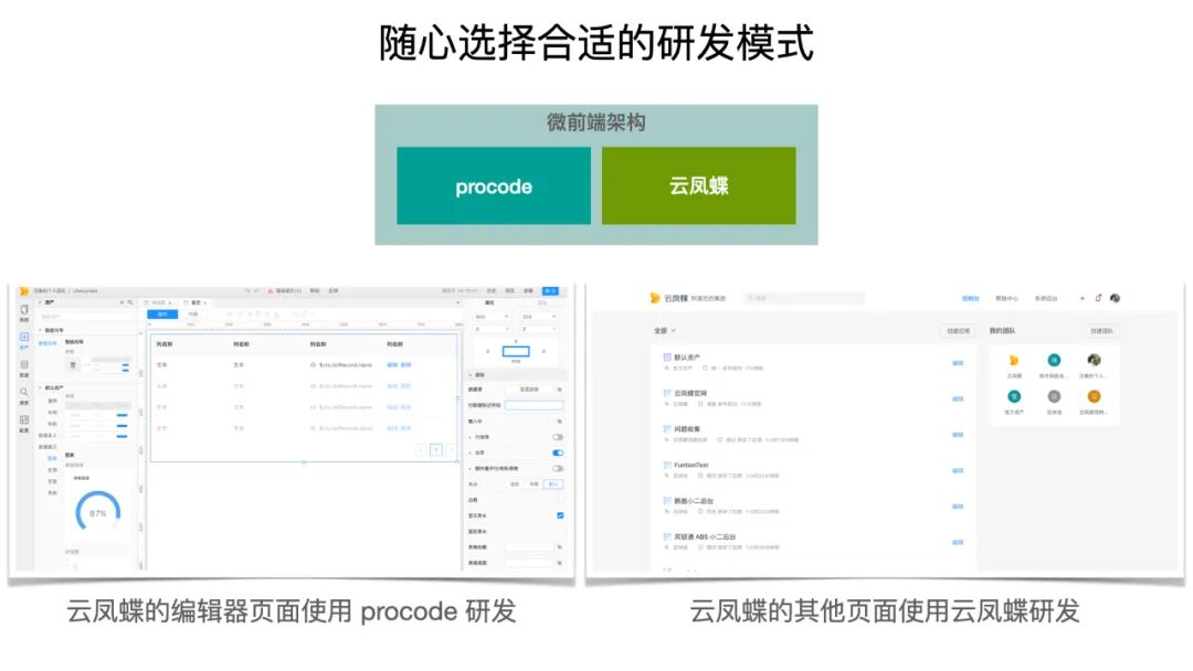 我们就做了一套方案,基于微前端的架构,把 Pro Code 和 Low Code 的应用给联合起来,作为一个开发者,他只需要随心地去选择合适他自己的研发方式就可以了。