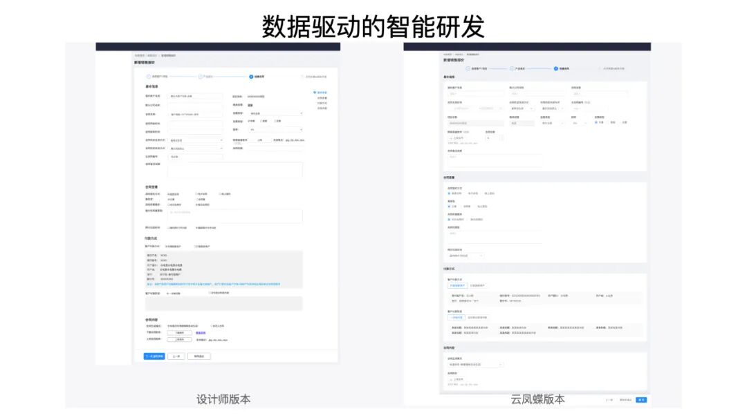 大家可以看一下,这张图是我们去年下半年的时候做的第一版技术原型,左边的是人工设计的版本,右边是云凤蝶设计研发的版本,大家会有比较明显的体感,会发现云凤蝶的版本更加精致一些。确实是这样,不是说人工设计的质量不好,而是 toB 的业务更多是理性的设计,要去做这个东西的话,往往可能有三、四百条设计规则在那等着你,作为一个人,是不擅长去记这些东西的,而这些恰恰是机器擅长做的。