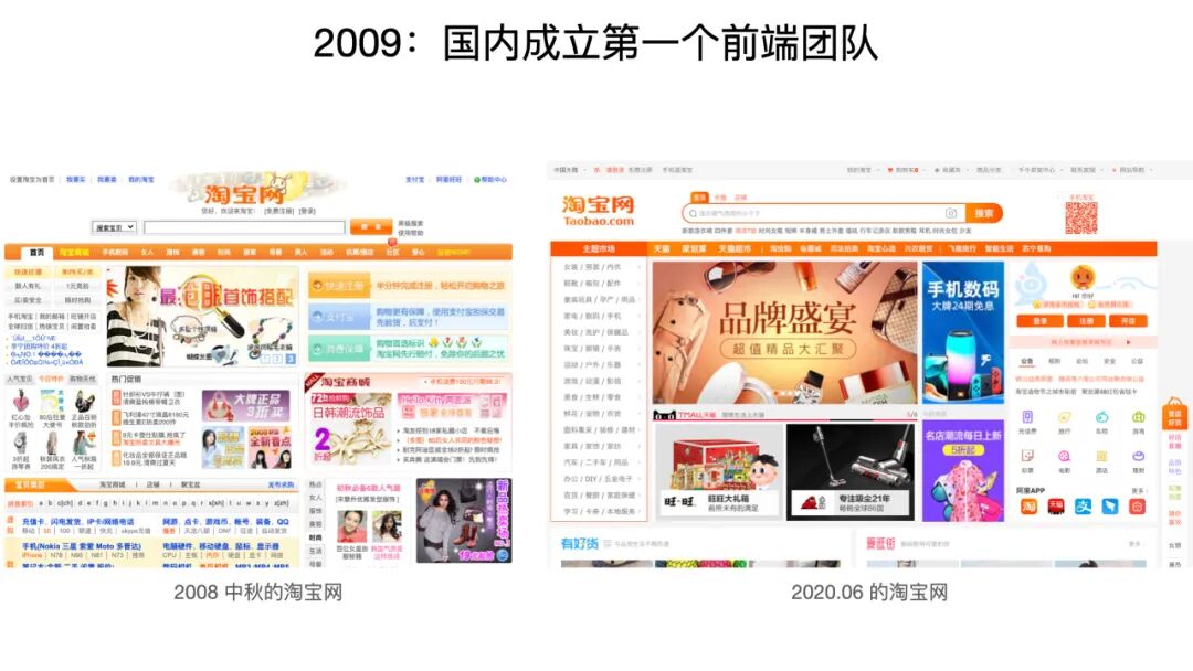 先看一下 2009 年,国内成立了第一个前端团队。大家刚刚如果有留意到主持人的介绍的话,会发现其实我是 2008 年入职淘宝的。那么那个时候我的主管是怎么发现我的呢?我当时在一家公司里面工作,工作之余还写博客,还会画一些跟程序员相关的有趣的小漫画。我估计大概是因为漫画吸引了非常多的人的目标,然后就这样进了淘宝。大家可以看一下左边这张图,是 2008 年中秋节时淘宝网的首页截图。在这张图上,我基本上是达到了人生的巅峰。大家不要误会哈,这不是我作为一个前端的巅峰,而是我作为设计师的一个巅峰。当时才刚刚流行做节日 Logo 没有多长时间,那段时间正好我们的设计师没空,这个时候我们的部门老板就说了,沉鱼你会画漫画对吧?那你要不要给我们画个中秋节 Logo 呀?我想来想去,那就画吧!画了之后这个 Logo 就真的上线了,被非常多的人看到。这个绝对是我在前端这个行业里面,作为设计师的一个高光时刻了。