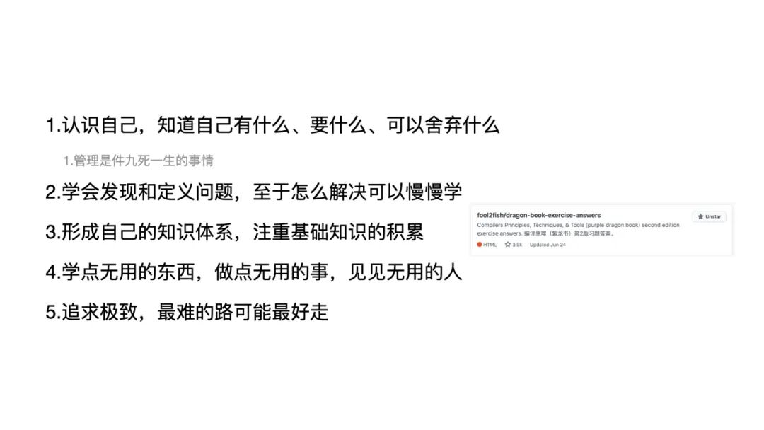 第四点就是学点无用的东西、做点无用的事,见见无用的人。这个可能跟前面的鳗鱼小姐姐的说法有一定等同,就是你现在做的这些无用的事,在未来总会连成一串。确实是这样,我回想了一下,在 2015 年参与开发 Chair —— 就是我们蚂蚁的 Node Web框架 —— 这个项目的时候,我做的几项工作。第一个是打通了跟现有 Java 服务体系,能做成这件事,来源于我工作了之后还花了比较多的精力去学 Java。另外一个就是把当时 Java 的 Velocity 模板用机器编译成了 nunjunks 模板,这个正好是因为之前学了那本龙书 —— 叫《编译原理》的那本龙书,学完了之后正好就用到了,这个东西如果要想现学的话可能就比较难了,因为我当时断断续续看了半年。这个仓库大家可以看一下,右边有一张截图,就是我当时的一些习题记录放在了 GitHub 上,很多同学在进入阿里之后就慢慢地不怎么更新了,我也是一样的,没办法,工作太忙了。但是这个仓库的 Star 数是一直在涨的,因为你可能找不到第二份习题答案。今天趁着这个大会也想呼吁一下今天的听众同学,如果有同学对这个东西比较有兴趣的话,也欢迎成为这个仓库的维护者,因为我实在是忙到无力维护这个东西好多年了,但是我不断地看到有人在用,不断有人提 PR,我觉得荒废掉挺可惜的。
