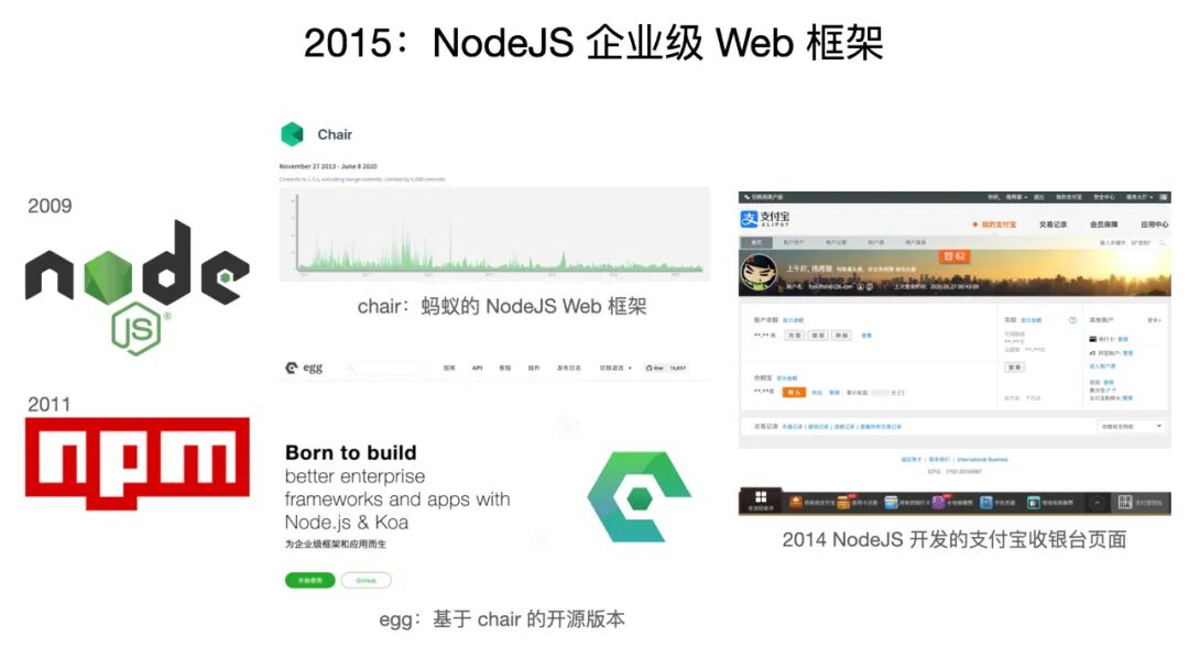 大家看中间的这一张图,这是我们当时的代码提交的记录图,可以看到至今还是非常活跃的。这个框架叫做 Chair,我在这个框架里面主要是参与打通跟现有技术体系的连通的这一部分。下面的叫做egg,是 Chair 的一个开源版本,也就是说对于其他公司的同学来说,如果他想用这个东西的话,他可以基于 egg 来做自己的企业级 Web 框架。那么在这个框架上,我们的第一仗是什么呢?在当时流量最 Top 的支付宝收银台页面上,我们把它用上去了。