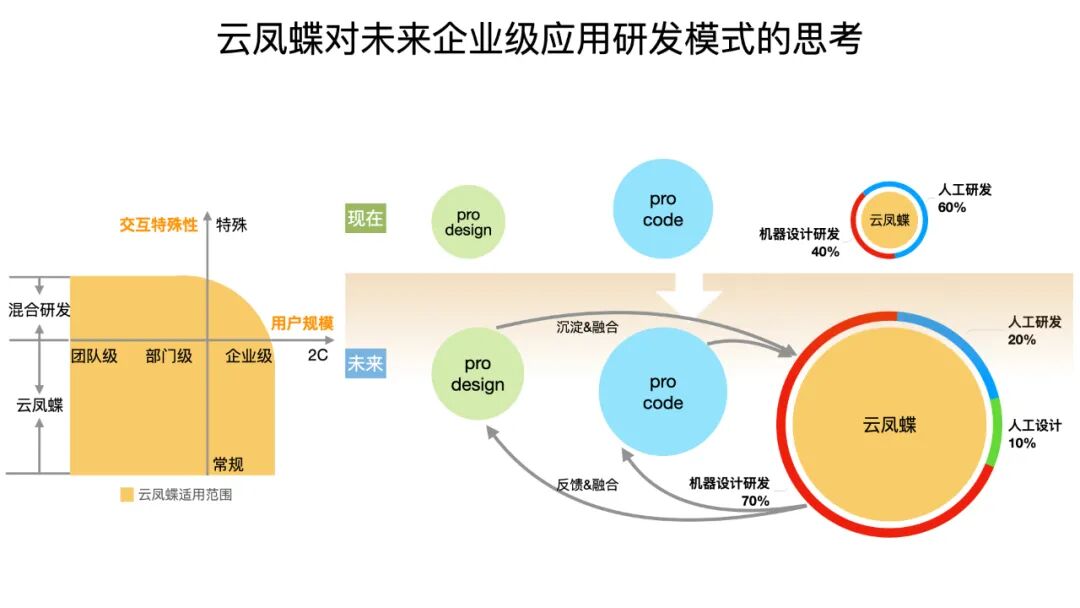 那么对于未来的企业研发模式,我们认为它是怎么样的呢?就是右边这张图,上面是现状,有大量的 Pro Design、Pro Code。云凤蝶去年下半年发了第一个版本之后,去年大概有差一点不到 20% 的业务是由云凤蝶来承载的。这对云凤蝶来说非常不容易,我刚刚讲了,我们上面有OB 这样的业务在,所以要承载很多复杂应用的研发是很大的一个挑战。在去年数据里,有 40% 的产物是通过机器来做设计研发的,大概 60% 是人工。
