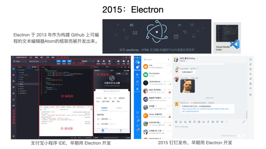 其实 2015 年还发生了很多的事情,大家可能也不是很记得。其实 2015 年也是钉钉发布的第一年,在这一年里,有一个关键词叫做 Electron,Electron 是一个能让 Web 开发的同学用 Web 开发相关的技术做 Native 应用的一种技术,它最早其实是 GitHub 的 Atom 编辑器的副产品 —— 它一开始确实是个副产品,而后面就变得独立起来了。