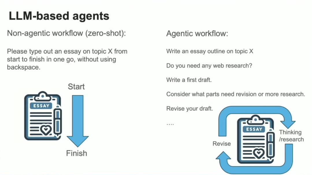 吴恩达在演讲中,特别以 “基于 LLM 的智能体 (LLM-based agents)” 为例,展示了 Agentic Workflow 如何提升 AI 系统的性能表现。
