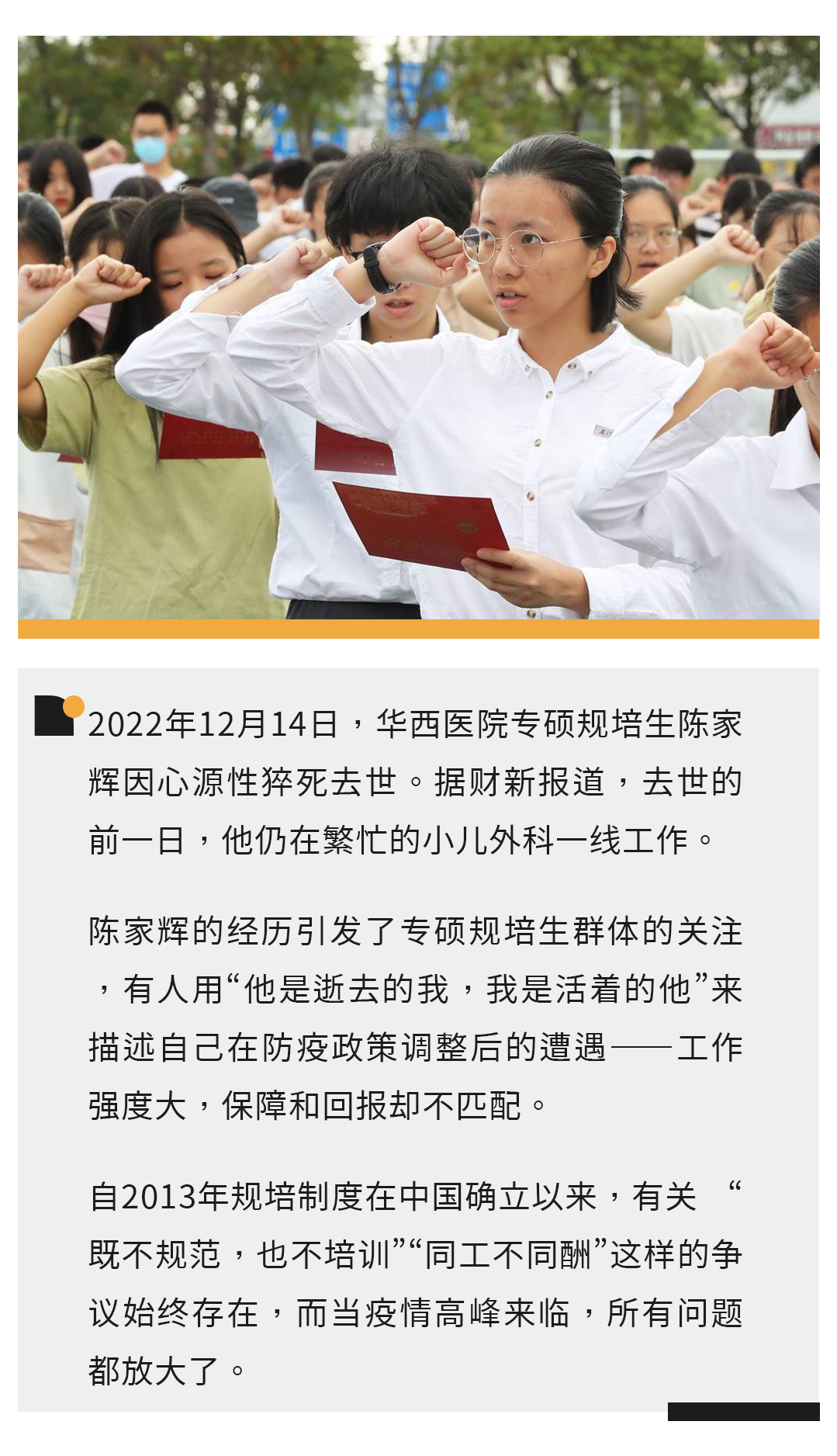 去年12月14日,华西医院专硕规培生陈家辉在完成临床任务后心源性猝死去世。据财新报道,陈家辉在ICU抢救时,新冠核酸检测结果呈阳性。悲剧发生后,多位规培生告诉我们,他们所在医院和学校都变得更重视专硕生的权益。