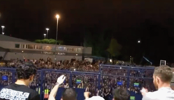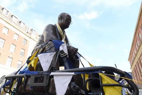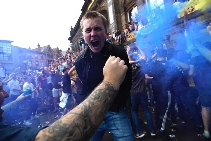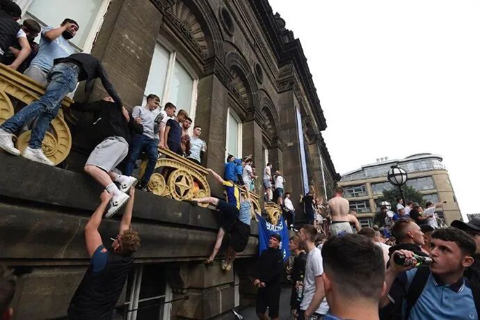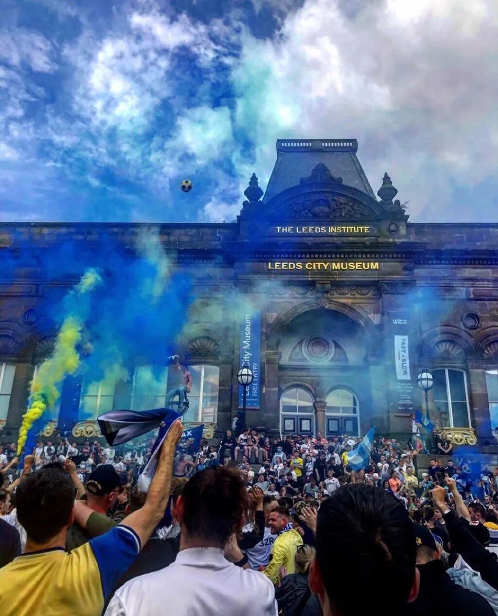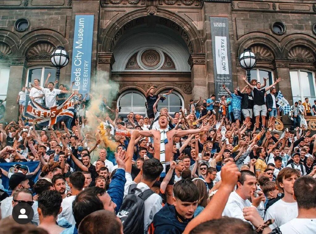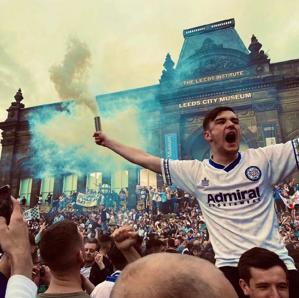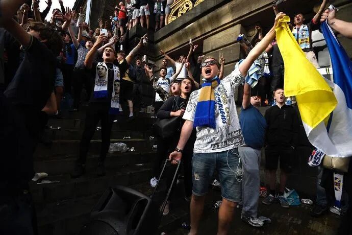 冲超成功后,憋了16年的利兹联球迷拥趸聚集到利兹市博物馆外的千禧广场,他们有的赤膊上阵,有的爬上博物馆阳台,有的挥舞旗帜,还有的点燃了蓝黄色的烟火。