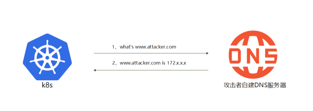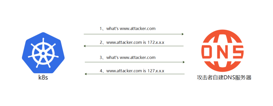 在通过安全校验之后,K8s将会发起第二次域名解析。由于攻击者将DNS TTL设置的数值极其小,此时DNS缓存已失效,k8s需要重新发起域名解析请求以获取www.attacker.com的ip地址,流程见下图: