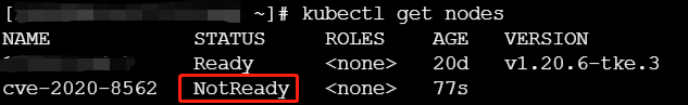 从上图红框处可以发现,此时我们创建的cve-2020-8562节点的状态为NotReady,但即使此时cve-2020-8562节点的状态为NotReady,也并不影响后续的利用流程。