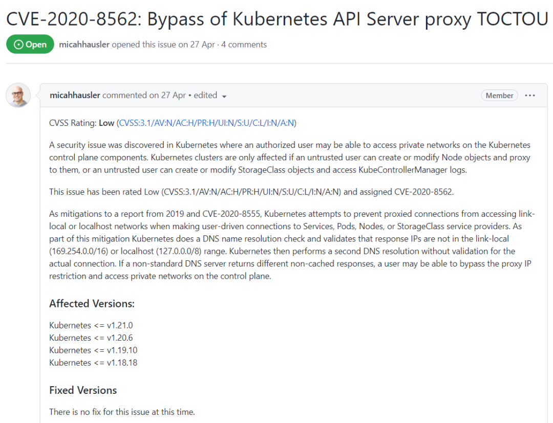 在安全研究以及运维中,一些低风险的集群漏洞极其容易被安全以及运维人员所忽略,但是这些漏洞在一些特定场景中仍为云上安全带来了极大的安全挑战,正如本文中所举例的CVE-2020-8562安全漏洞,这个仅有2.2评分的Kubernetes安全漏洞,在与实际业务结合后,仍可为业务带来极大的安全风险。因此与云上安全相关的漏洞,无论严重与否,都应得到安全人员以及运维人员的相应重视。