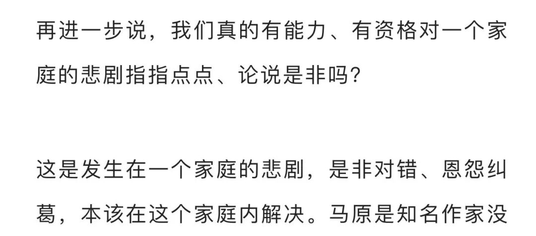马原老师的情况也许有所不同,但是这种辩护逻辑本身真的是极端荒谬。在一个家庭里,当强势者伤害弱势者的时候,你让他们“在家庭内解决”,请问弱势者怎么解决?如果《城堡里的马原》所述事实成立的话,马原不让儿子上学接触同龄人,让儿子带着一颗有问题的心脏住在高海拔的城堡里,请问他十来岁的儿子怎么去“在家庭内部解决”?