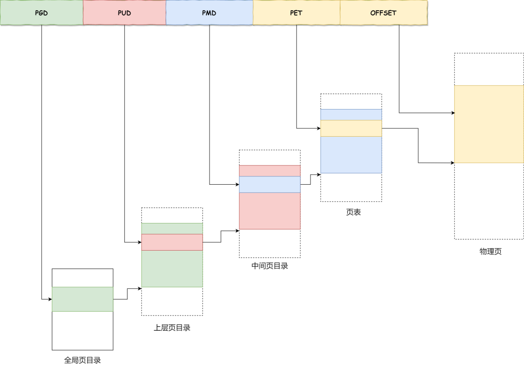 对于 64 位的系统,两级分页肯定不够了,就变成了四级目录,分别是: