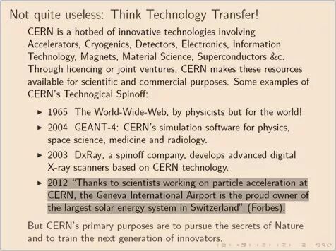 被称为“粒子物理标准模型”之父的世界著名理论物理学家格拉肖(Sheldon Lee Glashow)在以“我们为什么要进行基础研究(WhyWe Must Pursue Basic Scientific Research)”为题的报告中说:CERN是创新技术的温床,包括加速器、低温、探测器、电子、信息技术、磁铁、材料科学、超导体等领域。CERN通过特许经营或合资,使这些技术资源应用于科学和商业的目的。