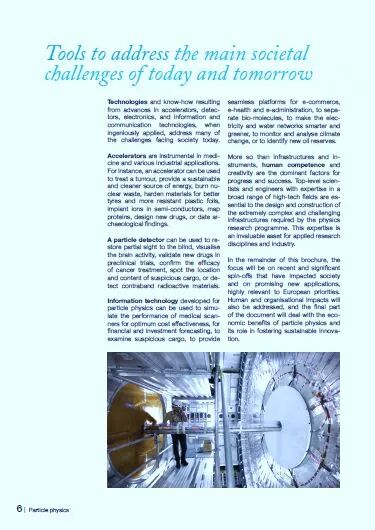 CERN在题为“粒子物理是欧洲社会经济挑战的关键驱动因素(Particlephysics, a key driver for innovation Facing Europe’s socio-economic challenges)”的宣传册中指出:粒子物理的综合及复杂的工具是新概念、创新和突破性技术的丰富来源,它使各种应用研究学科受益,并最终被应用到许多对经济和社会产生重大影响的应用中。
