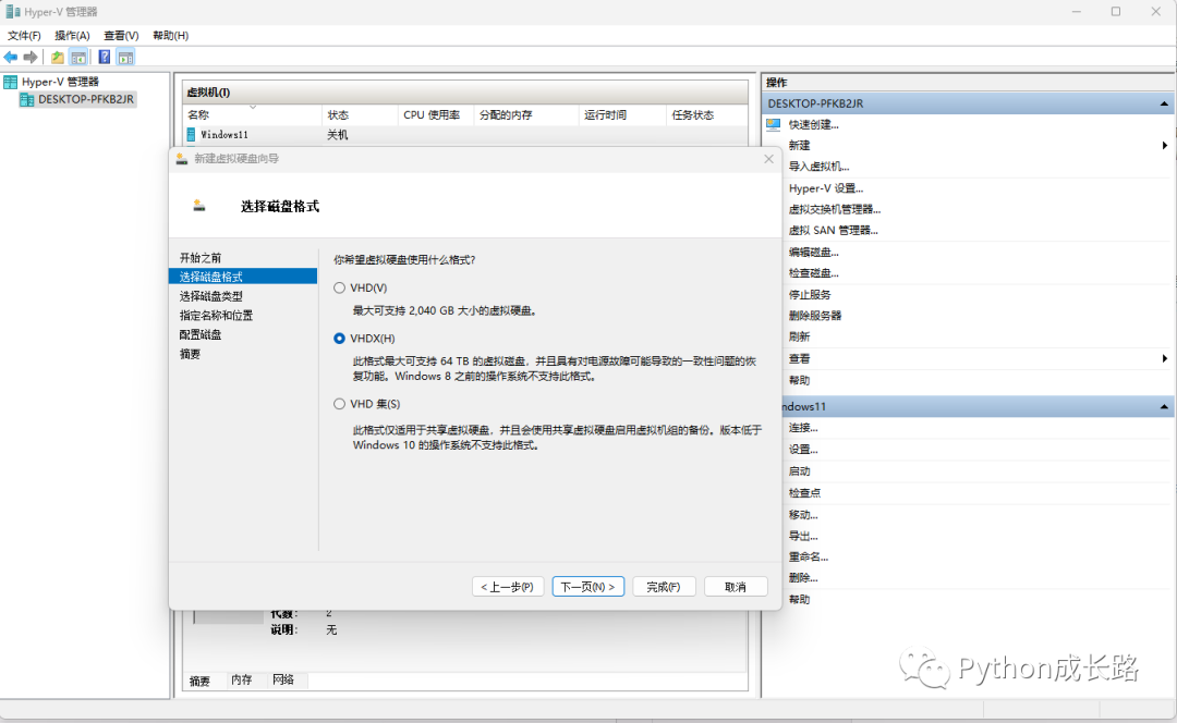 这里我用Hyper-v管理器来创建,格式选VHDX,类型选固定大小,磁盘空间至少是300G。