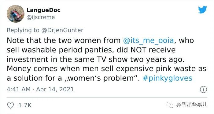 “他们不仅把手套做成粉色,还加了荒唐的粉色税:通常的乳胶手套在德国只要他们这粉色手套价格的一半(我不知道他们的手套是什么做的)。”