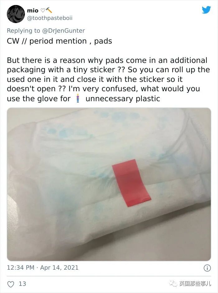 他们认为设计这个粉红手套,一个可以防止扔卫生巾时,经血碰到手上,第二,还能把用过的卫生巾装在手套里,更“妥善”得被扔掉。
