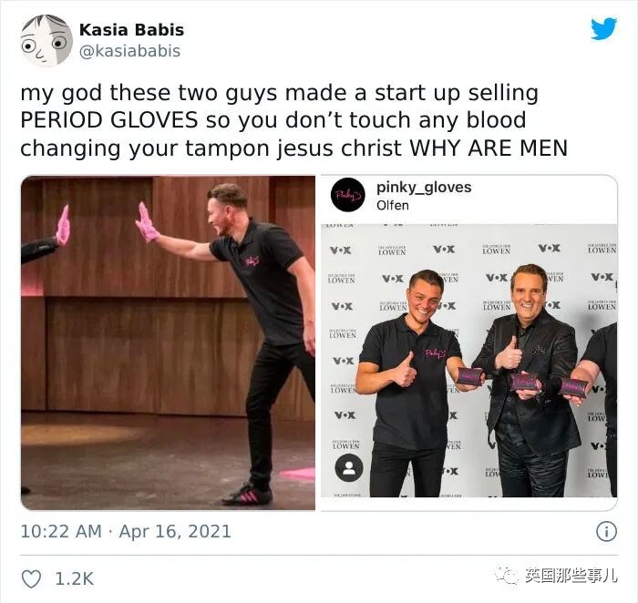 “我的天,这俩男人的创业公司在卖月经手套,让你换棉条时手不会触碰到经血。我的天,搞啥啊。”