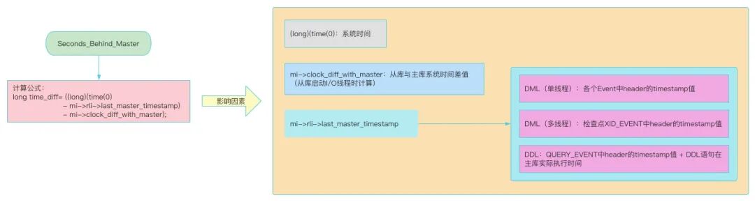 单/多线程的影响。Seconds_Behind_Master 字段的值是通过存储在主库 binlog event 中的时间戳与从库当前时间戳之差计算出来的(保留这个时间戳会通过复制拓扑同步到从库,如果主从库的操作系统时间戳存在差异,则还要减去此差值)。这意味着正常的复制情况下(排除人为在从库写入数据的情况)主库与从库上的 binlog event 的时间戳都来自主库。这种计算 Seconds_Behind_Master 字段值的算法存在一个问题:在单线程复制场景下,如果从库上通过客户端连接进入,并直接更新数据,可能导致该字段的值随机波动,因为有时候 event 来源于主库,有时候由从库直接更新产生的,而这个字段的值会受到后者的影响。但如果是多线程复制,则此值是基于 Exec_Master_Log_Pos 的 event 时间戳来计算的,因此可能不会反映从库最近提交的事务的位置。