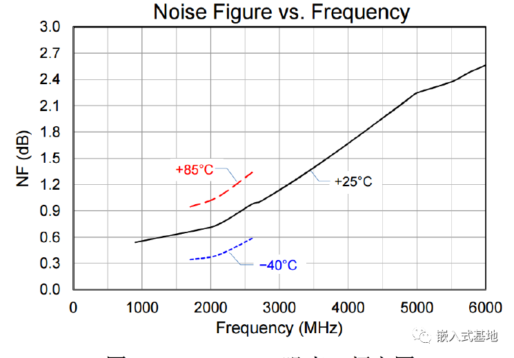 根据公式可以看出, 当网络的额定功率增益远大于1时, 系统的总噪声系数主要取决于第一级的噪声系数。系统所采用的前噪放大器TQP3M9035在低频段的噪声系数低于0.6dB,非常合适用作前级低噪声放大器,其噪声-频率关系如图