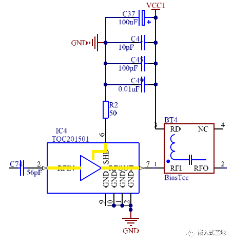 本系统采用TQP3M9035和ADL5531做为固定增益放大器,其内部阻抗均为50Ω,外围电路较少,电路简单。Bias Tee为直流偏置器,具体电路如图所示