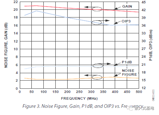 题目要求在通频带40M-200M的最大增益Av≥52dB,50M-160M带内起伏小于2dB,输入信号频率 f≤20MHz 或输入信号频率 f≥270MHz 时,电压增益 Av均不大于 20dB。ADL5531 的P1dBm为20dB左右,其带内增益平坦度小于1dB,噪声系数小于3dB,两级级联可达40dB,其增益—频率关系如图所示