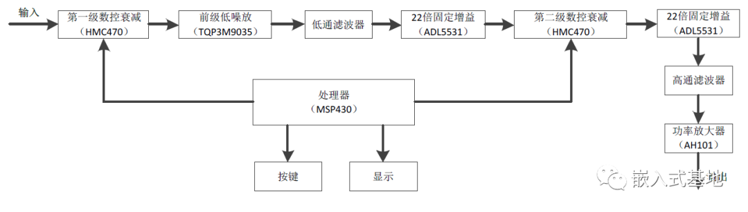 本系统前级通过低噪放TQP3M9035实现固定增益21dB,中间由两级ADL5531实现44dB固定增益,增益调整由8dB电阻衰减网络和两级0~31dB数控衰减器HMC470实现,通频带外衰减采用椭圆带通滤波器,末级由功率放大器AH101实现13dB固定增益,提高输出功率。系统总增益为70dB,控制范围为10~70dB,其框图如图: