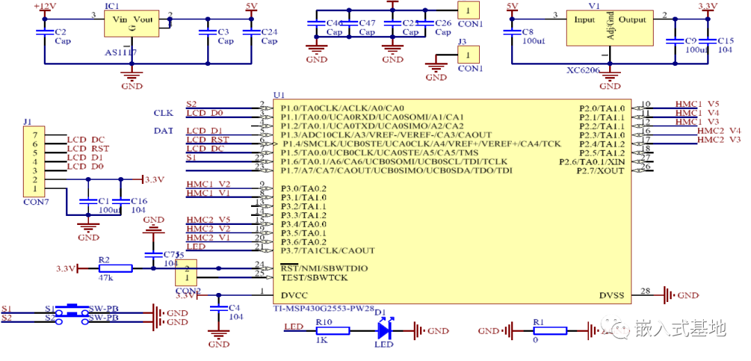 本设计采用了超低功耗微处理器MSP430G2553来实现控制,单片机控制电路由复位电路、稳压电路和OLED显示屏组成。由单片机IO口对HMC470衰减器进行控制,具体设计电路如图所示