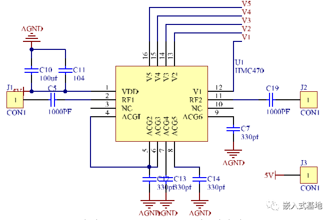 系统末级采用AH101芯片推动输出功率,为防止电路自激,此部分采用独立的一个屏蔽盒安装,独立的稳压网络,设计出电路如图所示