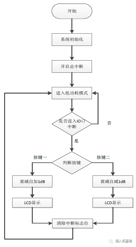 程序部分主要有OLED显示屏驱动、按键检测、HMC470控制驱动,处理器进行按键检测并控制衰减器的衰减,通过显示屏显示相关参数。程序流程如图所示