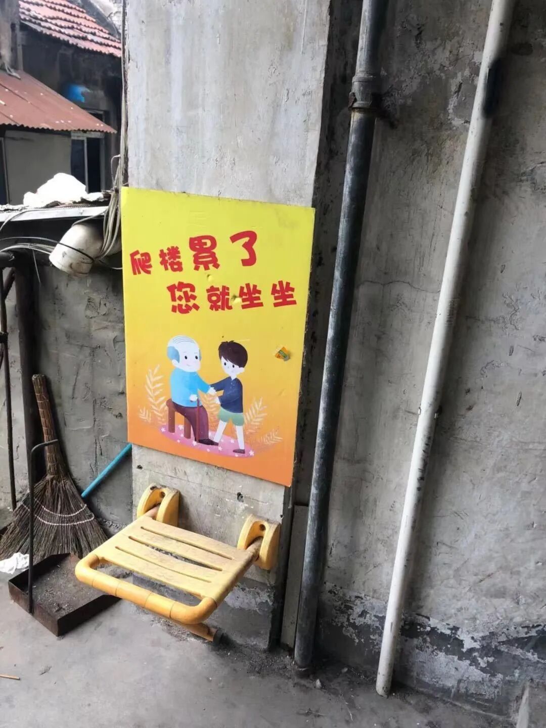 我在这条巷子里面闲逛过很多次,每当在里面迷路找不到出口的时候,我会先去寻找一个嵌在墙上的折叠椅子当标记,上面写着“爬楼累了,您就坐坐”。