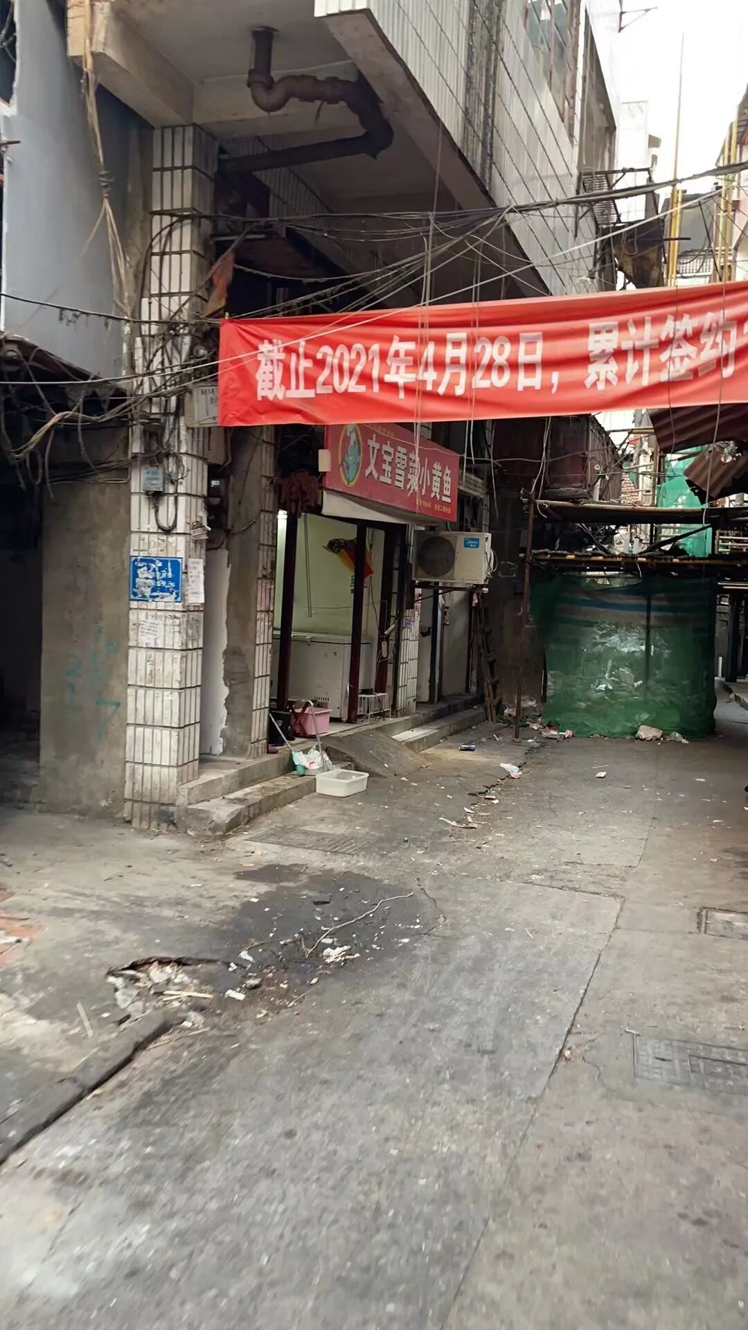这个入口连接的巷子,正好在一家招牌上写着“小黄鱼”的网红餐馆对面。它位于拆迁区划之中,巷子里面挂着一面褪色的横幅,上面标着已签约的拆迁居民数量。