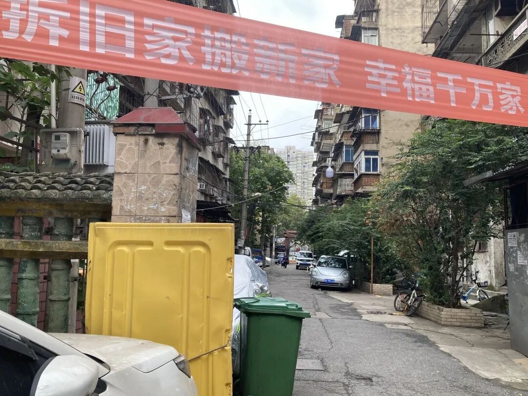 沿着这条小巷一直走,就到了绍兴片区的另一侧,社区挂着不少类似巷子口那样的横幅,拆迁的气氛十分浓郁。落灰的汽车外贴上了一圈“回收废旧汽车”的小广告。