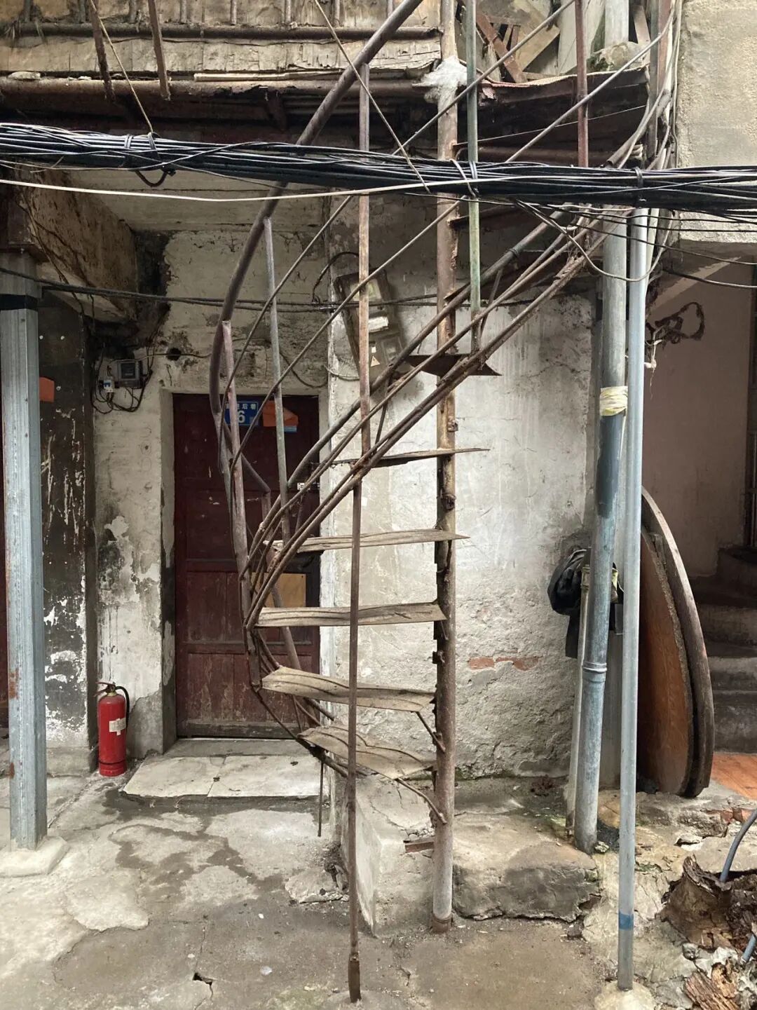 而几间房子开外的院墙上,靠着一个同样是居民自制的旋转楼梯——原本的楼梯出口已经被瓦砾挡住。一根钢管插在地面上,钢筋编织出了楼梯的梯段,栏杆部分则是木条。楼上传来小孩子的叫喊声,原来仍然有人居住在二楼的狭窄空间里。