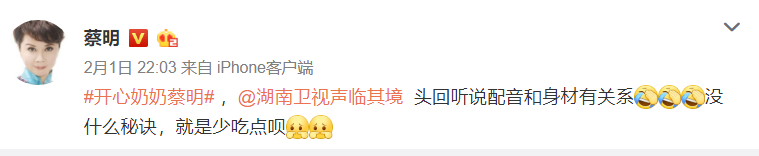 面对这群“羡慕嫉妒恨”的网友,蔡明倒是显得淡定。2月1日晚,她在微博上主动回应:“没什么秘诀,就是少吃点呗。“