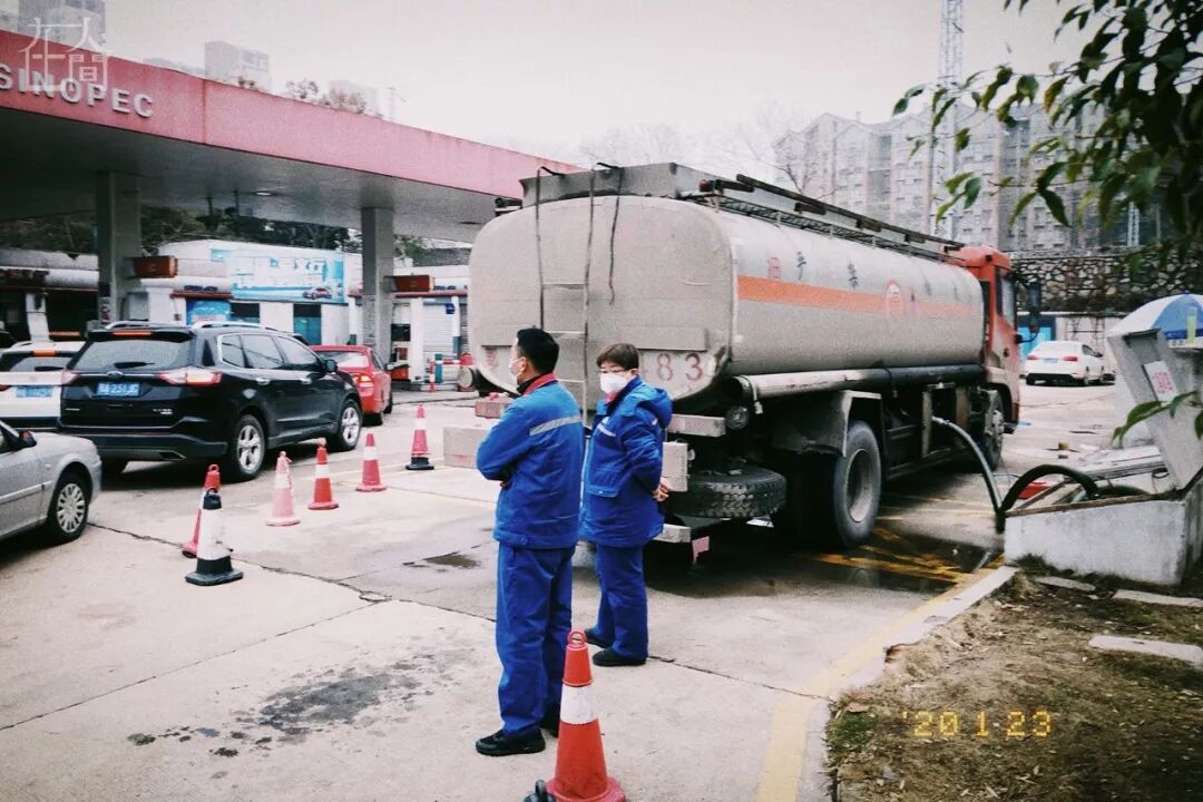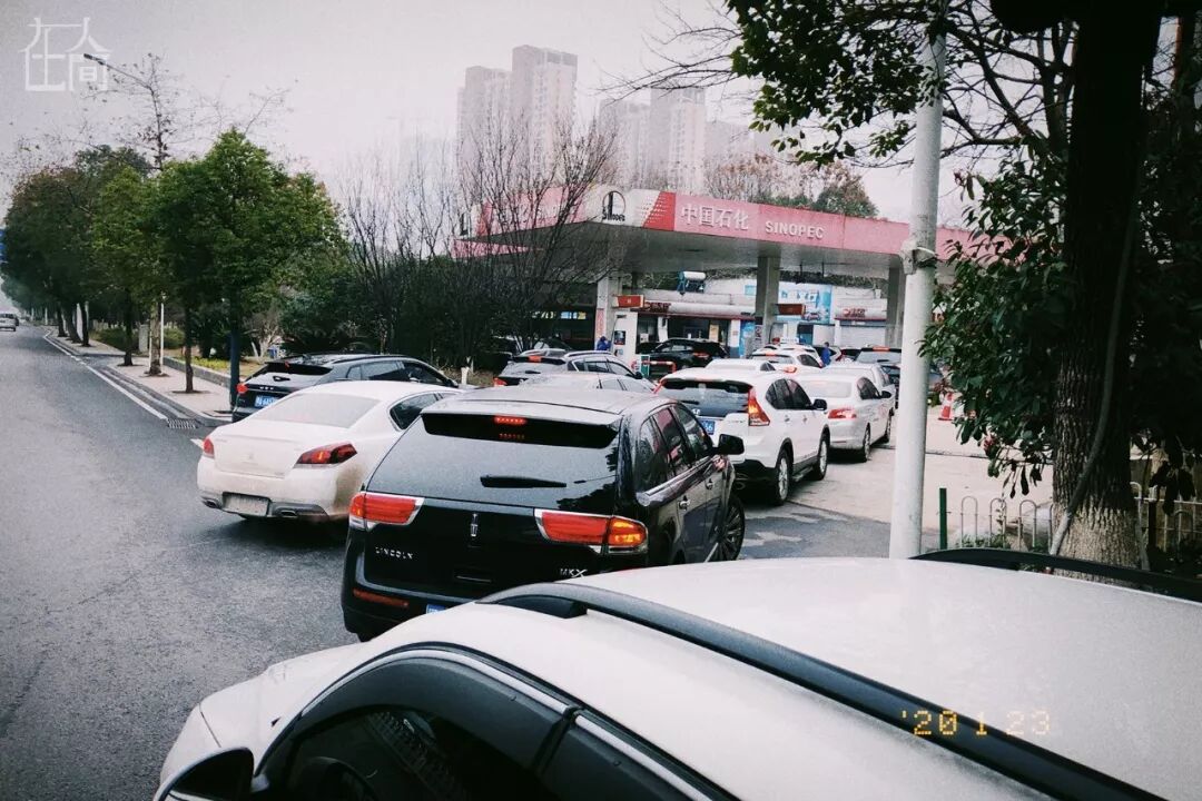 回程的路上看见有很多拉着行李箱打车的人,我很尊重他们的本能反应,只能说祝他们好运吧。■ 回程路过的加油站排起长队,大部分车都是准备离开武汉来加油。
