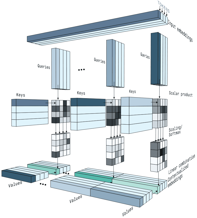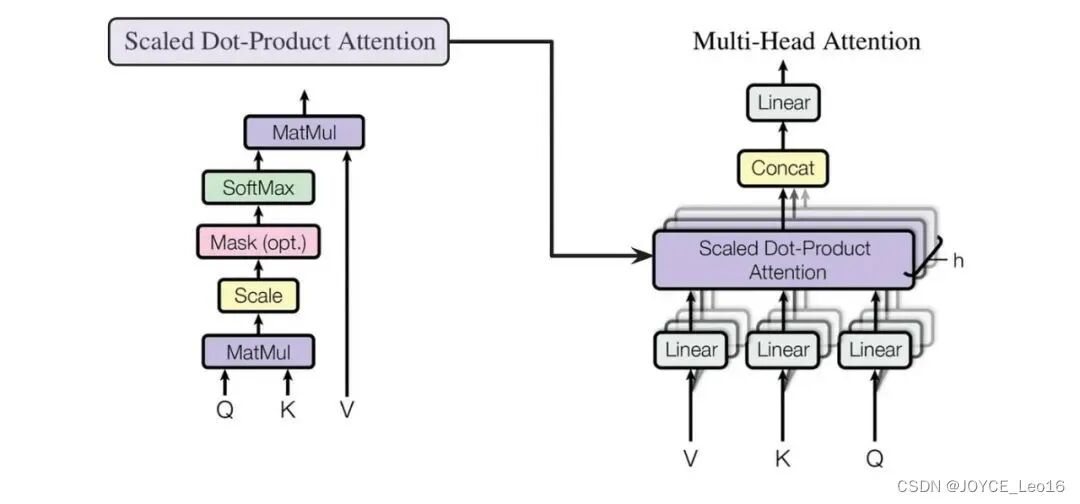 Q, K, V 的计算用到matmu矩阵乘法 matmul 是矩阵乘法的缩写,它是许多数值计算库(如NumPy、TensorFlow、PyTorch等)中常用的函数,用于计算两个矩阵的乘积。 在数学上,给定两个矩阵 A 和 B,它们的乘积 C 的计算如下: 如果 A 是一个形状为 (m, n) 的矩阵,B 是一个形状为 (n, p) 的矩阵,则 C 是一个形状为 (m, p) 的矩阵,其中每个元素 C[i][j] 是矩阵 A 的第 i 行与矩阵 B 的第 j 列的内积(即对应元素相乘后求和)。 import numpy as np A = np.array([[1, 2], [3, 4]]) # m x n 矩阵 B = np.array([[5, 6], [7, 8]]) # n x p 矩阵 C = np.matmul(A, B) # 计算矩阵乘积 print(C) 值得注意的是,在一些库中,如NumPy,也可以使用 @ 符号来表示矩阵乘法,即 C = A @ B 。 WQ,WK,WV 的作用 自注意力公式,也就是缩放点积注意力(Scaled Dot-Product Attention),计算的公式如下: 上图是 Self-Attention 的结构,在计算的时候需要用到矩阵Q(查询),K(键值),V(值) 。 Self-Attention 的输入是编码矩阵Y,则可以使用线性变换矩阵WQ,WK,WV 计算得到Q,K,V 。 Q K V 并不是公式中最本质的内容,本质的内容还是 编码矩阵Y Q K V 究竟是什么? 其实是 Y的 线性变换,我们看下面的图: