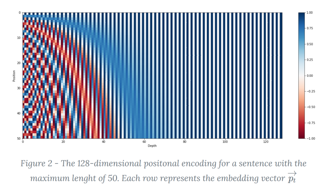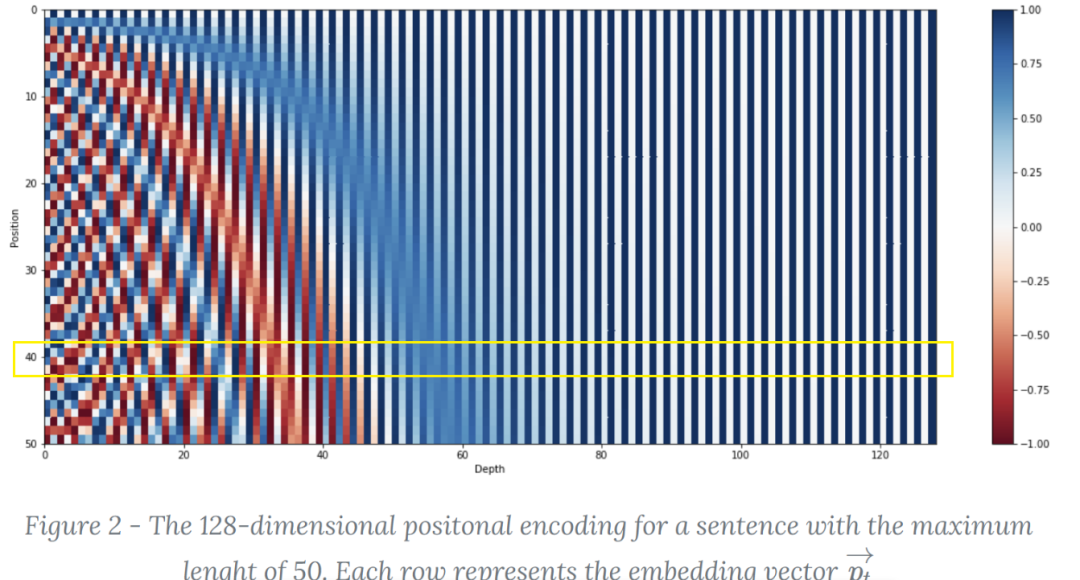 这个是一个长度为50个分词的句子,每一个分词的每一个维度所代表的 PE 矩阵。 y方向表示的是位置 position, 纵向是position, 最大之是一个句子的长度,此处是50,说明该句子包含50个单词,即上面的N 。 x方向表示的是 维度向量的index,上图中,每一个分词 的向量维度是128维度,奇数用位置相关的sin值,偶数用位置相关的cos值 比如说第40行,就是表示48个分词的 pt 向量,可以通过这个来表示位置