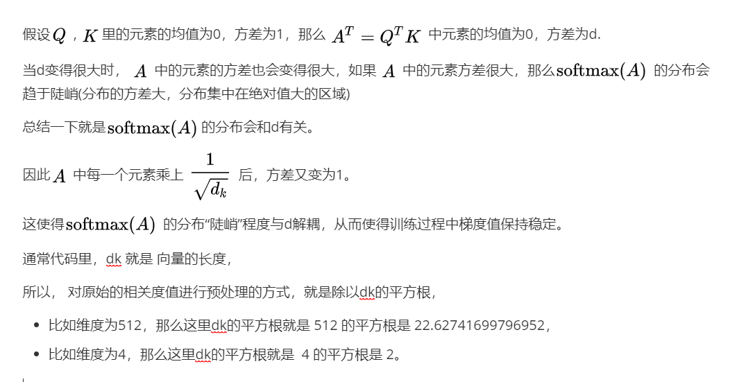 最终分词 1 的输出 Z1 等于所有分词 i 的值 Vi 根据 attention 系数的比例加在一起得到,如下图所示: 40岁老架构师尼恩提示:大模型比较难,功力浅的不容易懂。 这部分内容如果不懂,可以稍后去学习技术自由圈社群对应的配套视频《从0到1穿透LLM大模型架构》,具体请参见尼恩的公号,技术自由圈 Q、K相关度的Softmax归一化处理 得到QKT 相似度(相关度)自注意力原生矩阵之后,接下来,就需要进行Q、K之间的相关度的Softmax归一化处理,回到公式如下: 公式中计算矩阵Q 和K 每一行向量的内积,首先为了防止内积过大,在归一化之前,对原始的相关度值进行预处理。 这个预处理就是:通过缩放因子 公式 对attention为进行 scaled缩放。 40岁老架构师尼恩提示:大模型比较难,功力浅的不容易懂。 这部分内容如果不懂,可以稍后去学习技术自由圈社群对应的配套视频《从0到1穿透LLM大模型架构》,具体请参见尼恩的公号,技术自由圈 问题是,对attention为进行 scaled缩放?